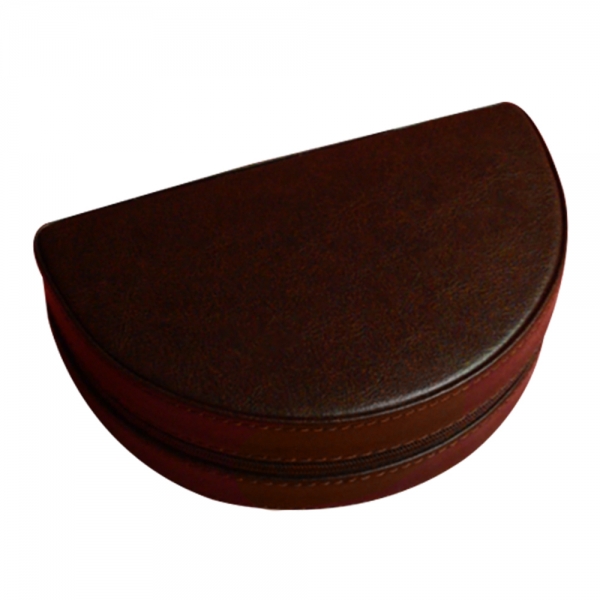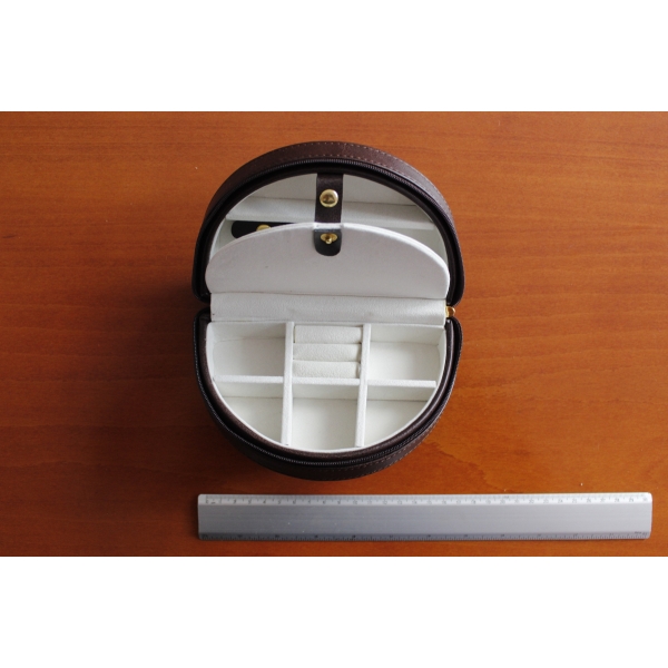 Reseña: Estuche de joyería, cuenta con un diseño color café y esta fabricado de vinil