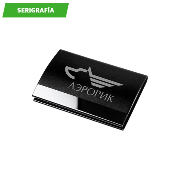 Descripción: Porta tarjetas con metal y cubierta de curpiel color negro.