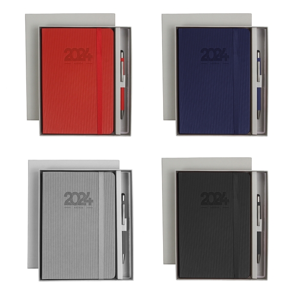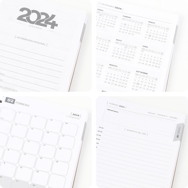 Descripción: Set de Agenda diaria 2024 con pluma y caja de regalo. Cubierta fabricada en curpiel (PU) con resorte sujetador e interior de 175 hojas de 65 g. (350 paginas) Cada día tiene espacio para tareas importantes y está organizada por horario (5:00 am - 22:00 pm). Cuenta con: Separador de hojas, Calendario anual 2023-2025, planeador mensual, hoja de objetivos anuales, hoja de pendientes mensuales, espacio para notas, tareas, sección de contactos y bolsillo interno para almacenar documentos. Incluye caja de cartón individual y bolígrafo con tinta de escritura negra.