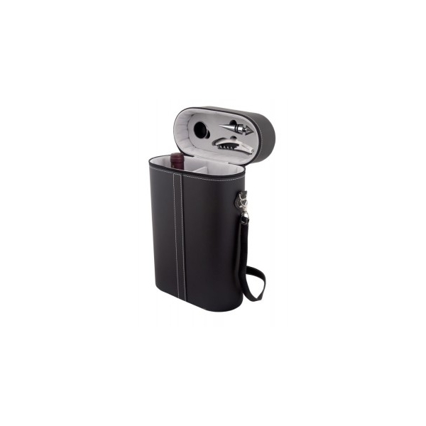Reseña: Atráctivo estuche de curpiel color negro para botella de vino con accesorios metálicos donde puedes grabar tu marca para que tus clientes te reconozcan