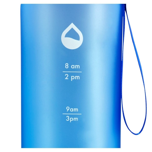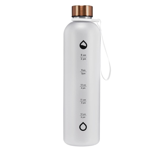 Descripción: Tapa metálica con cierre de rosca. Aro de plástico con asa de tela. Cuerpo con terminado en color frosty. Incluye marcador de tiempo para motivar tus hábitos de hidratación. Incluye caja individual.