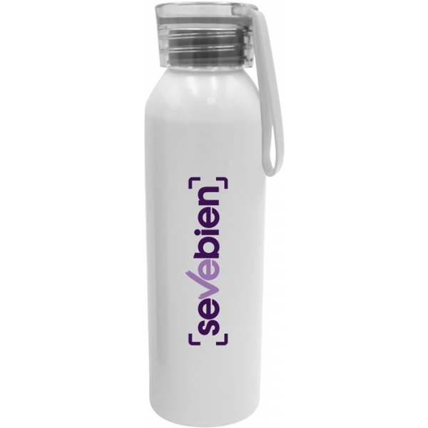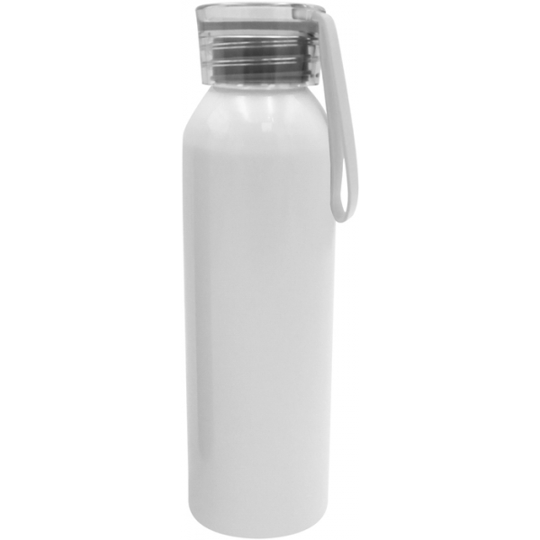 Descripción: Capacidad 600 ml. Aluminio sublimable. Botella de aluminio, cuerpo color blanco y tapa plástica translúcida con tira de silicona del mismo color de 8 cm de largo. Ideal para hidratarte todos los días. Caja de regalo en color negro mate.