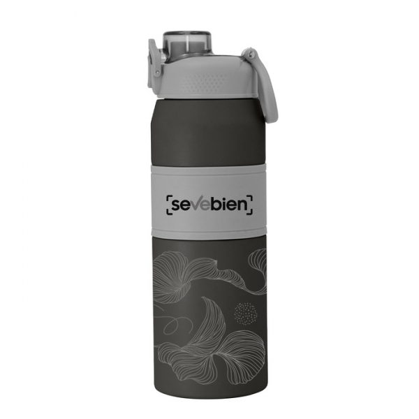 Descripción: Botella deportiva con doble pared, sellada al vacío. Interior de acero 304 y exterior de acero 201. Pintura powder coat (pintura más duradera y resistente a la corrosión y el paso del tiempo). Tapa plástica a rosca en color gris con anillo de silicona y manija plástica para su agarre, combinada con tapa rebatible en colores translucidos a juego con el color de la botella. Boquilla con sorbete incluido. Grip de silicona color gris para mejor agarre. Mantiene alrededor de 8 hs la temperatura de las bebidas calientes y frías.