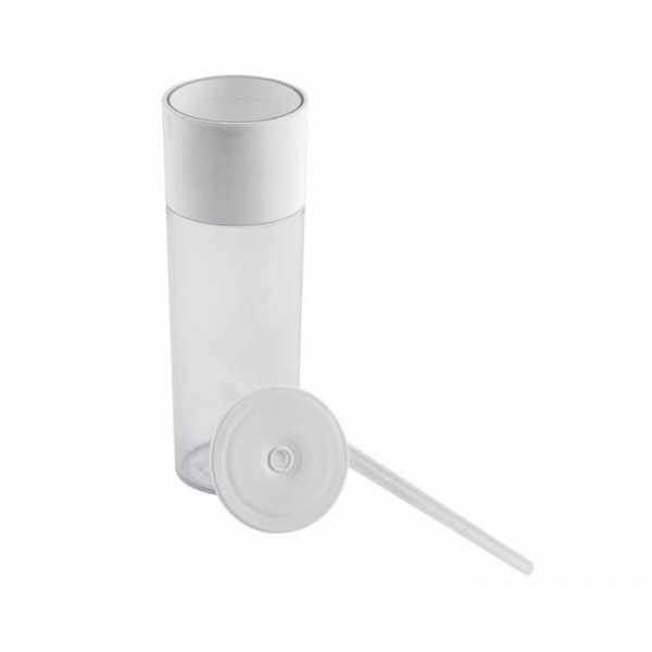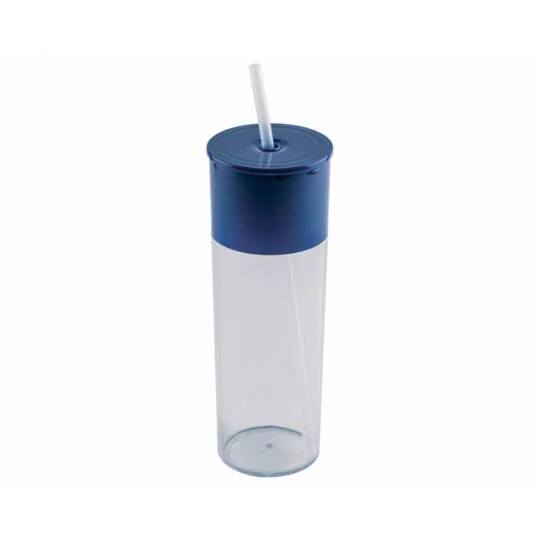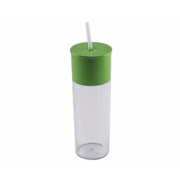 Descripción: Cilindro de plástico transparente con tapa de presión a color. Incluye popote rígido con seguro, su amplia apertura permite una fácil limpieza y llenado. CAP. 520 ml.