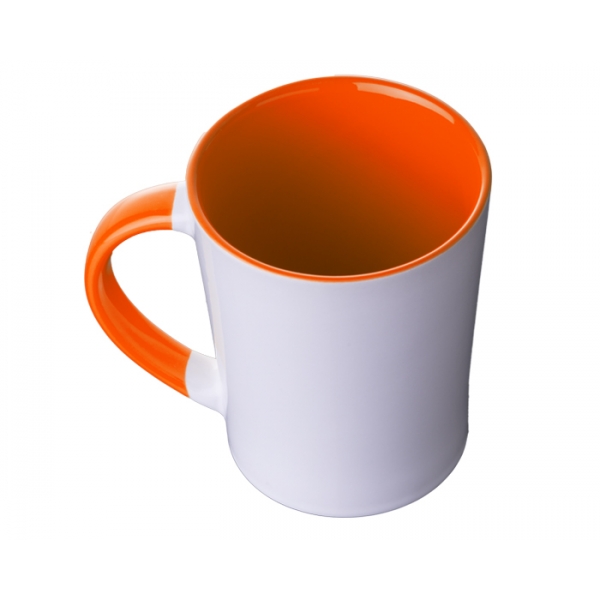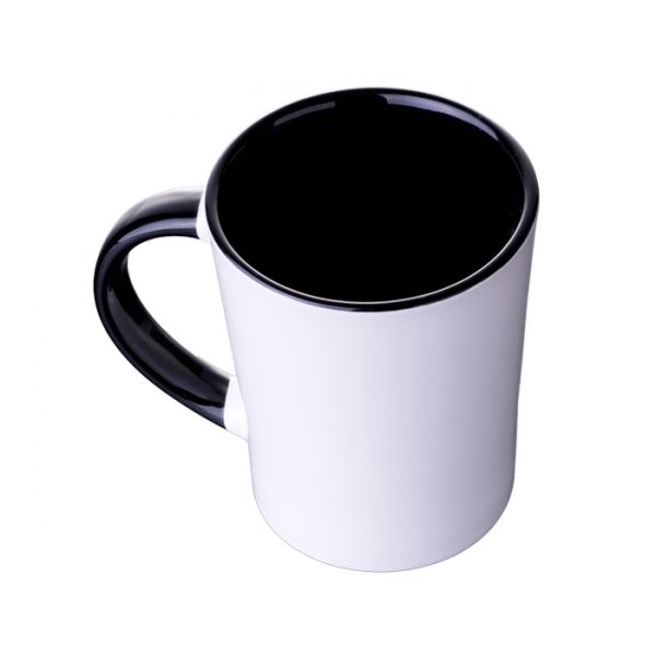 Descripción: Tarro de cerámica bicolor, forma cónica, con asa en combinación con color interior, acabado liso vitrificado. Cap. 12 OZ.