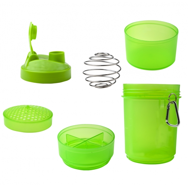 Descripción: Cilindro de plástico con compartimentos, resorte de acero y colador. Ideal para gimnasio cap. 450 ml