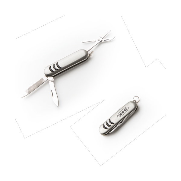 Descripción: Mini navaja metálica que contiene: tijeras y doble navaja con lima, cuenta con arillo para usar como llavero.