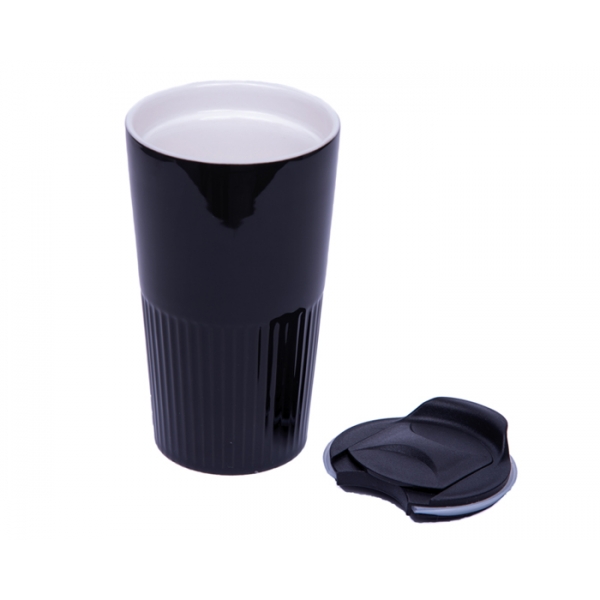 Descripción: Vaso de cerámica de doble pared con recubrimiento brillante. Tapa de presión con seguro deslizable. CAP. 300 ml. Presentación: caja en color blanco.