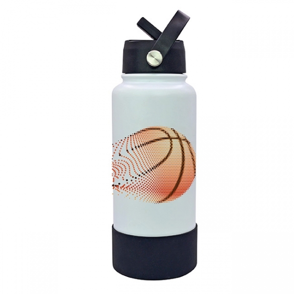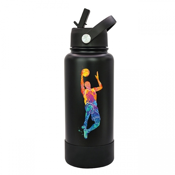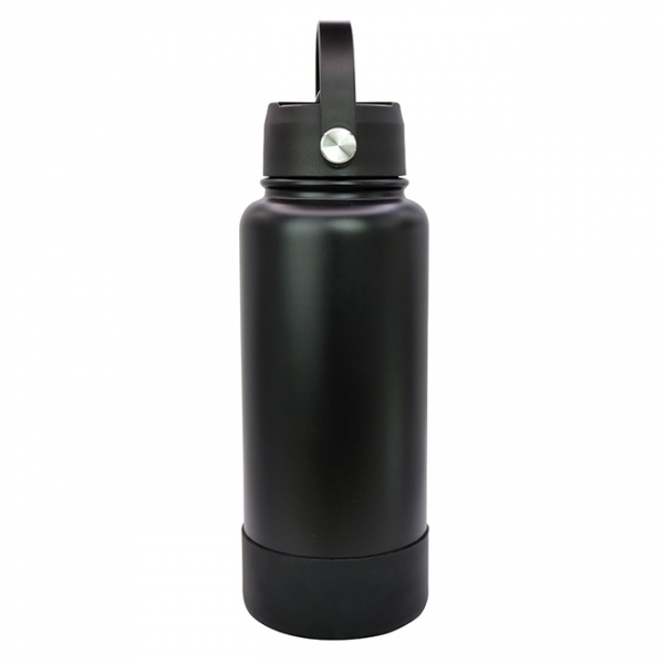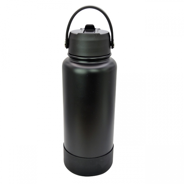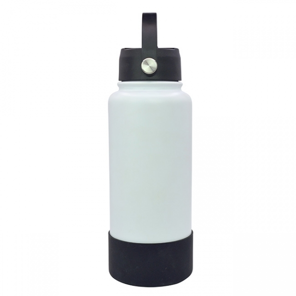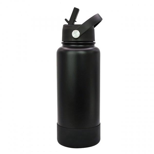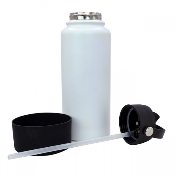Descripción: Termo Sabino l Capacidad: 1 lt. l Sistema de doble pared al vacío. l Tapa en rosca con asa rotativa, boquilla deslizable y popote. l Funda protectora antiderrapente en base l Colores: Blanco y Negro