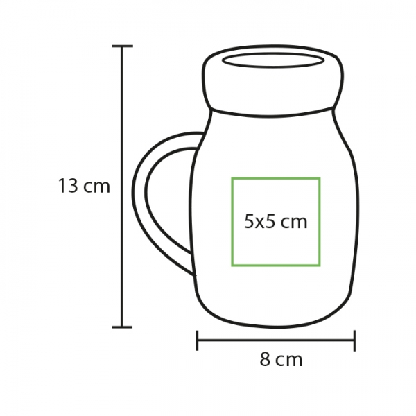 Descripción: Taza fabricada en cerámica con asa y tapa, capacidad 450 ml.