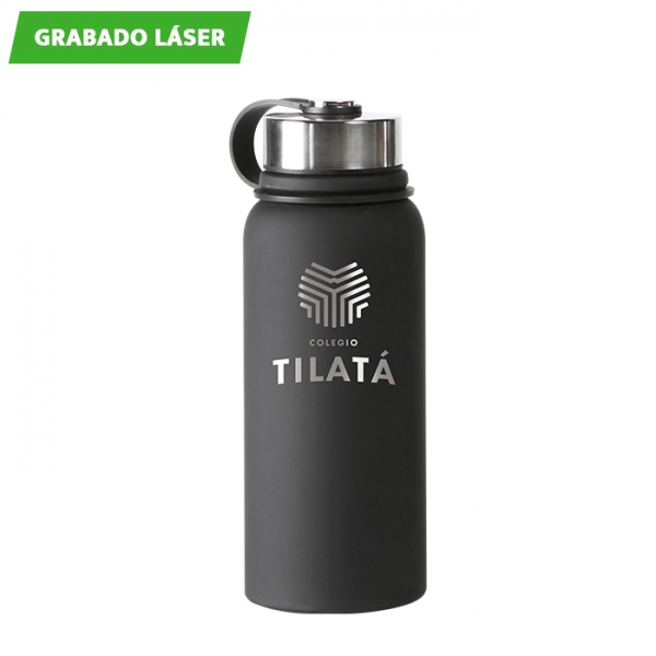 Reseña: Gigante termo de 800 ml y acabado rubber que con el grabado láser te dará unos acabados impresionantes. La tapa se enrrosca pero igual tiene sujteador para que no se pierda.