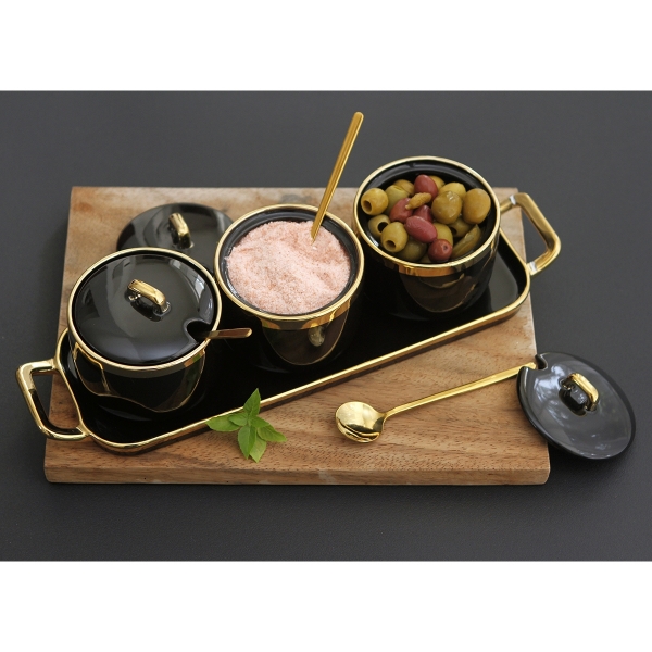 Descripción: Set de 3 contenedores de cerámica de 320 ml con detalles dorados en tapas, incluye base del mismo material y cucharas metálicas. Fabricados en materiales de grado alimenticio, no aptos para microondas. Incluye caja de cartón