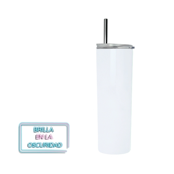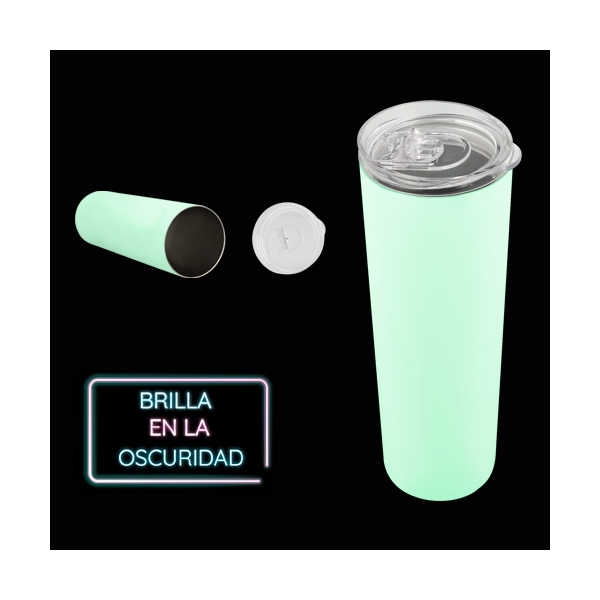 Descripción: Termo de acero inoxidable con con doble pared insulado al vacío que brilla en la oscuridad. Incluye tapa de plástico a presión con boquilla deslizable y popote de acero inoxidable.