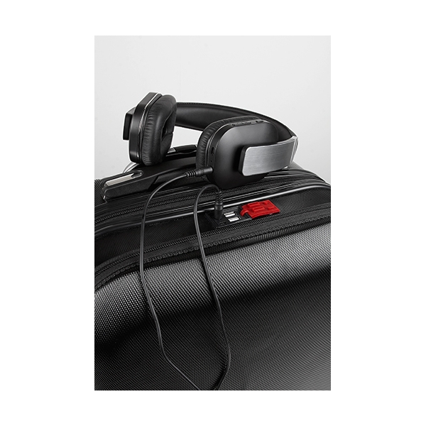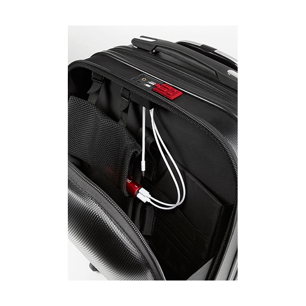 Descripción: MALETA RAINIER(Maleta trolley 4 ruedas. Cierre frontal con espacio para laptop y organizador de documentos. Cierre principal con 2 compartimentos internos. Placa metálica removible para fácil grabado y candado de seguridad con combinación de 3 d&iac) - Material: Estireno / Poliéster.