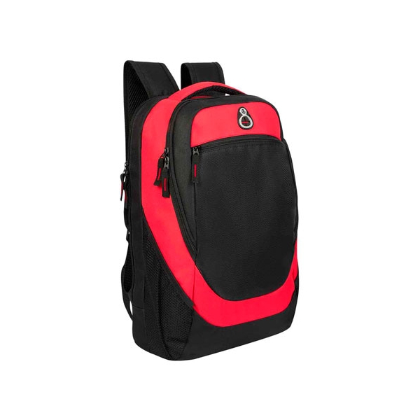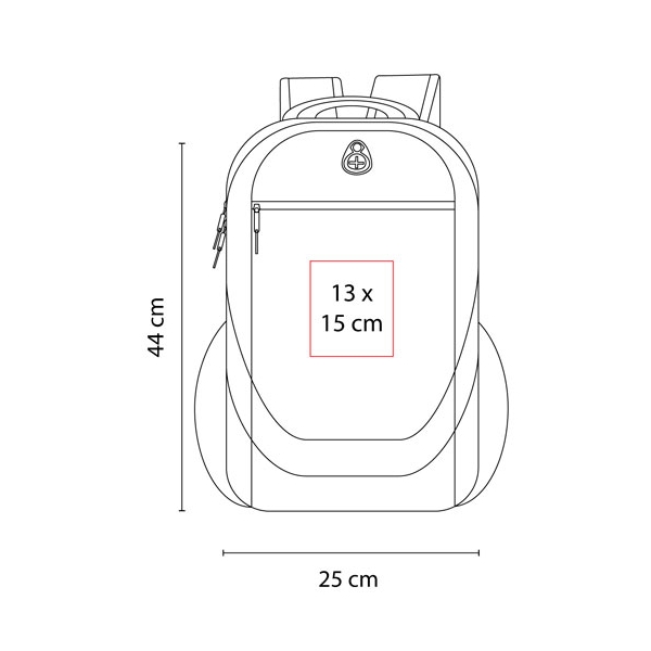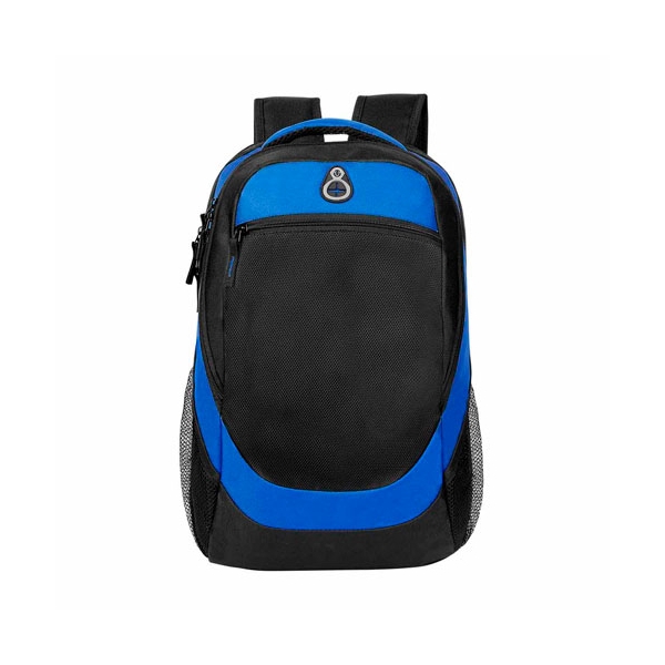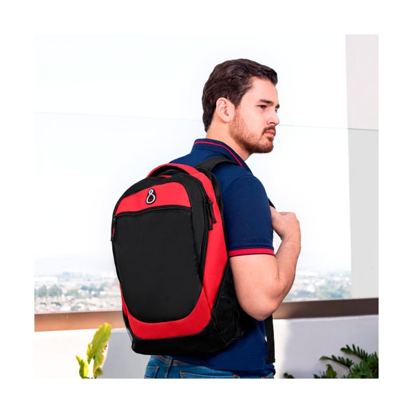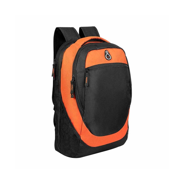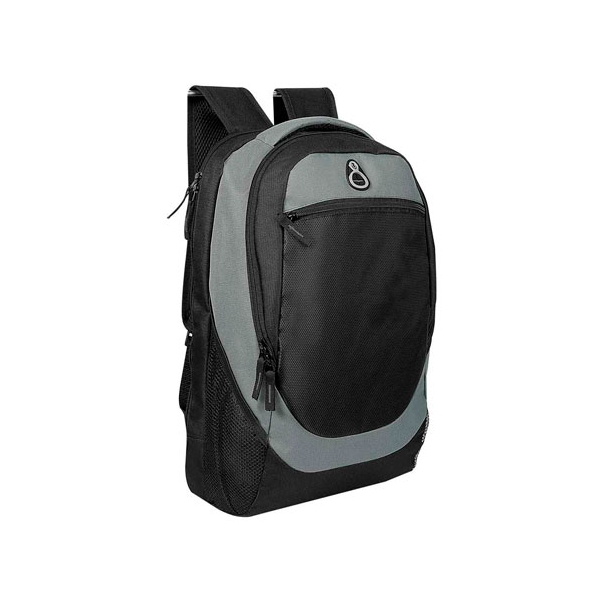 Descripción: MOCHILA ALGARVE (Bolsa principal, compartimento para laptop. Bolsa frontal con cierre. 2 Bolsas laterales de red. Salida para audífonos.)