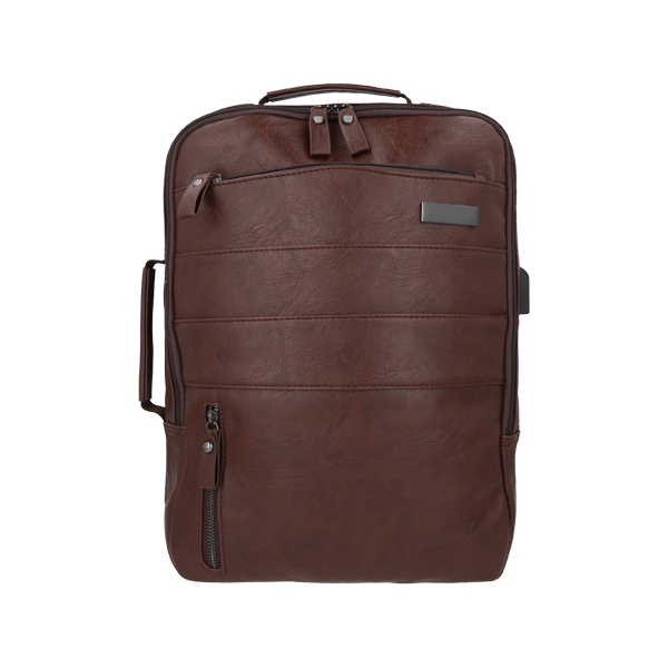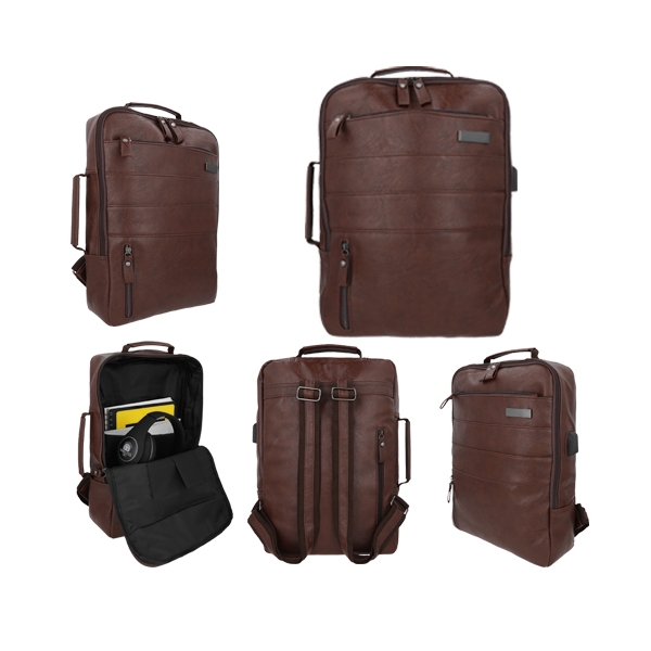 Descripción: Mochila de curpiel con interior de poliéster, placa metálica y 3 compartimentos, asa, bolsa principal con cierre, compartimento inferior con cierre, compartimento trasero con cierre, entrada lateral para batería portátil y audífonos (incluye cables), compartimento para laptop max. de 16 pulgadas, correas ajustables y asa extra que puedes utilizar para convertir la mochila en portafolio.