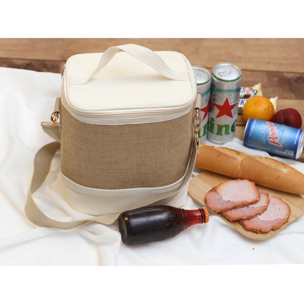 Descripción: Hielera fabricada en algodón y yute, con relleno de espuma de polietileno y forro elaborado en PEVA con correa.