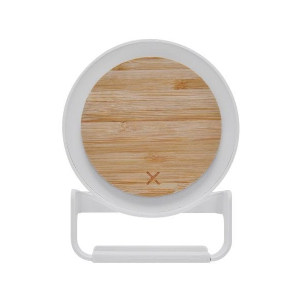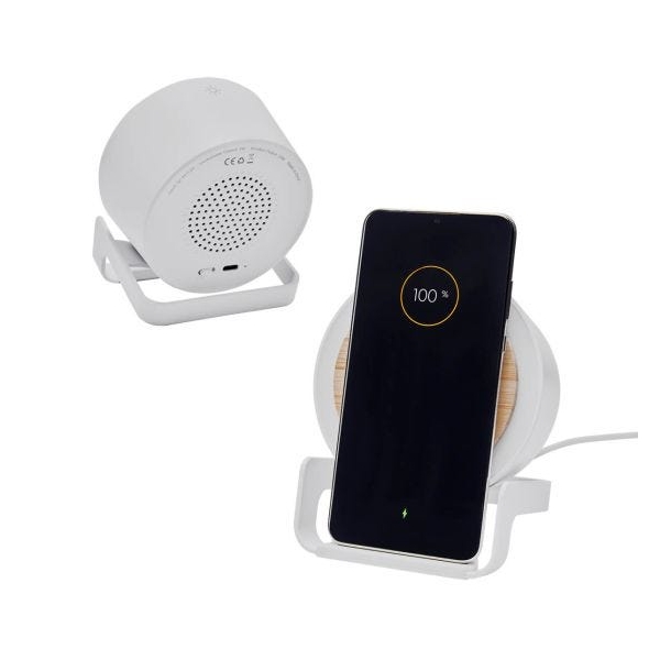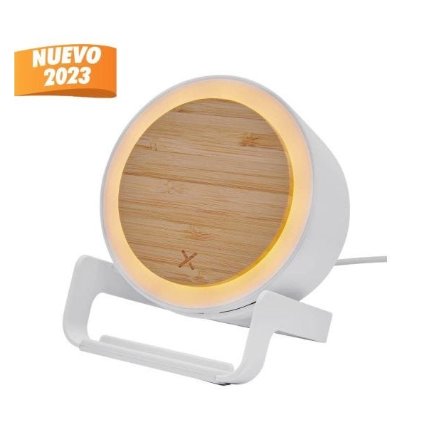 Descripción: Bocina bluetooth con cargador inalámbrico de 5W y luz LED ajustable a 3 diferentes intensidades. Soporte vertical para teléfono celular. Incluye cable cargador USB.