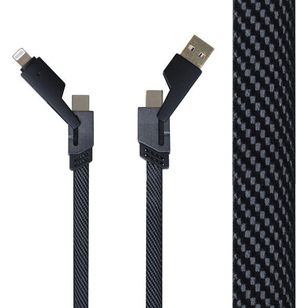 Descripción: Cable de carga rápida 4 en 1. Incluye conector de entrada USB y USB-C, conector de salida lightning (8 pines) y tipo C. Su cable plano con diseño trenzado evita enredos y nudos. Soporta la carga de smartphones, tabletas y otros dispositivos con entrada de carga rápida de hasta 65 W. Admite la transferencia de datos. Incluye caja individual.