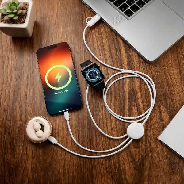 Descripción: Cable cargador 5 en 1. Incluye conector de entrada USB y tipo C, conector de salida lightning (8 pines), micro USB, tipo C y cargador inalámbrico para reloj inteligente (compatible con dispositivos que cuenten con tecnología de carga inalámbrica). Este cable multifunción, permite cargar varios dispositivos simultáneamente, lo que te ayuda a ahorrar tiempo y espacio. No admite la transferencia de datos.
