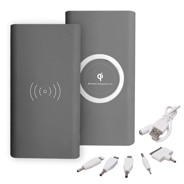 Descripción: Power Bank con diseño 2 en 1: funciona como una plataforma de carga Qi o un banco de energía ideal para viajes. Soporta la carga de hasta 2 dispositivos simultáneamente. Color Gris Incluye cable con 5 diferentes adaptadores de carga con 8 000 mAh. Color Negro Incluye cable USB con entrada para android con 10 000 mAh.