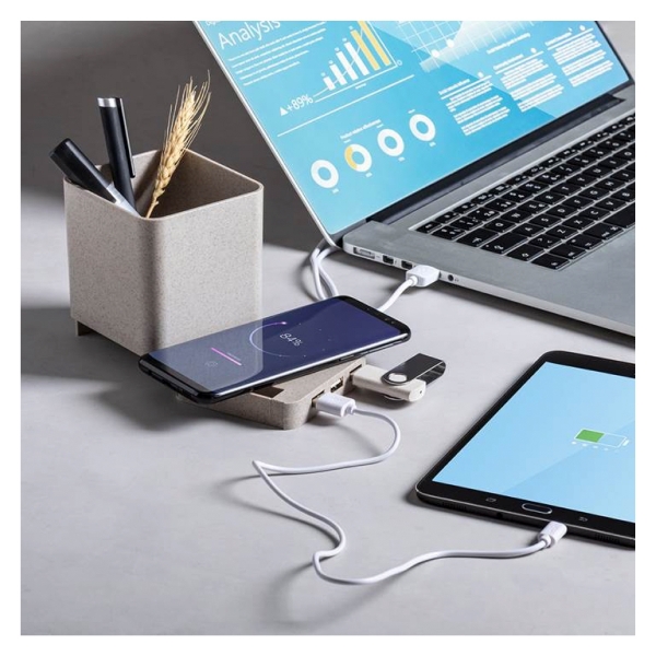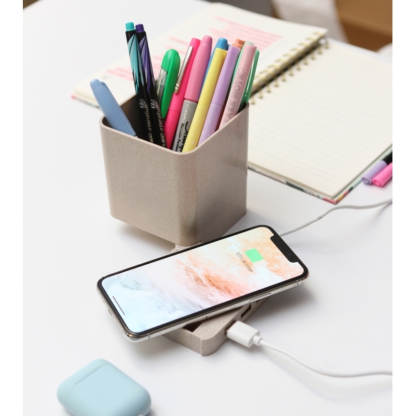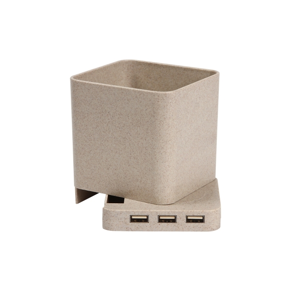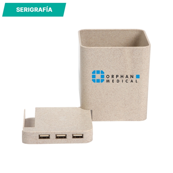 Descripción: Porta lápices fabricado en fibra de trigo y plástico ABS, con cargador inalámbrico para dispositivos móviles de 5W y 3 salidas USB. Carga a través de cable USB (incluido). Incluye caja de cartón individual.