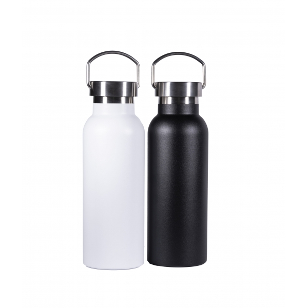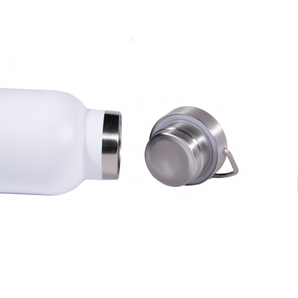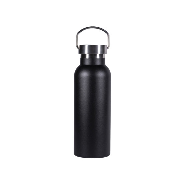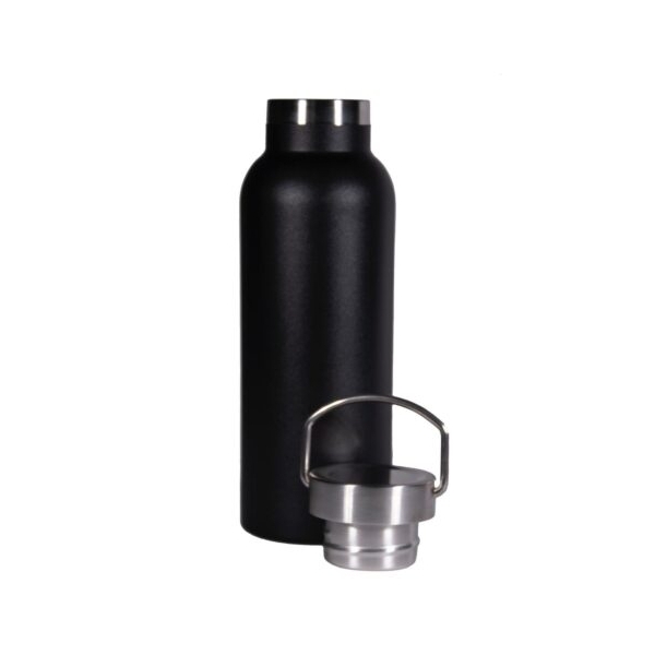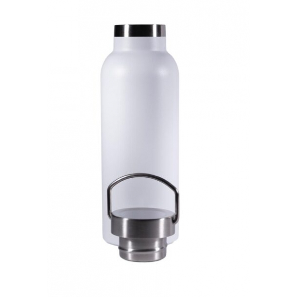 Descripción: Termo botella fabricada en acero inoxidable de grado alimenticio, con doble pared y aislamiento al vacio. Tapa metálica con asa.