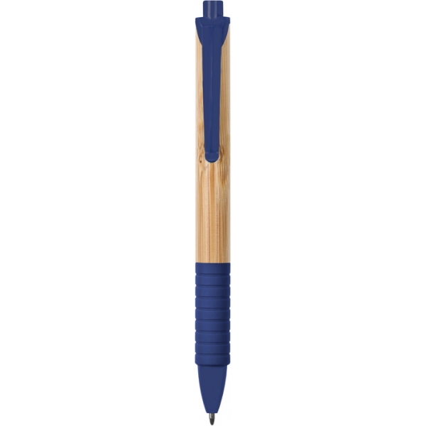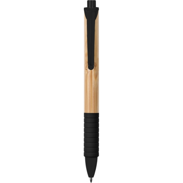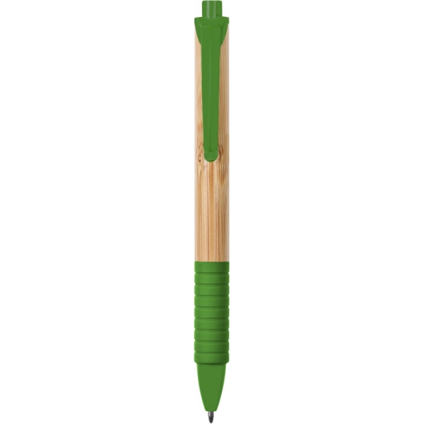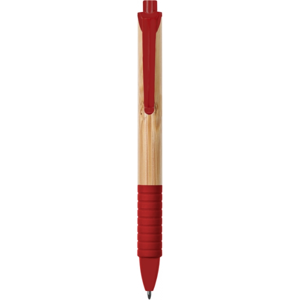 Descripción: Bambú. Cuerpo color madera. Pulsador, clip y punta plástico de color, grip de goma a juego. Tinta negra.