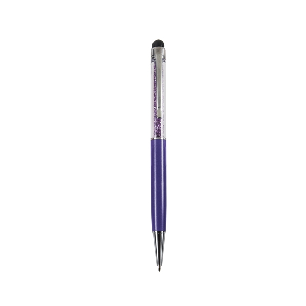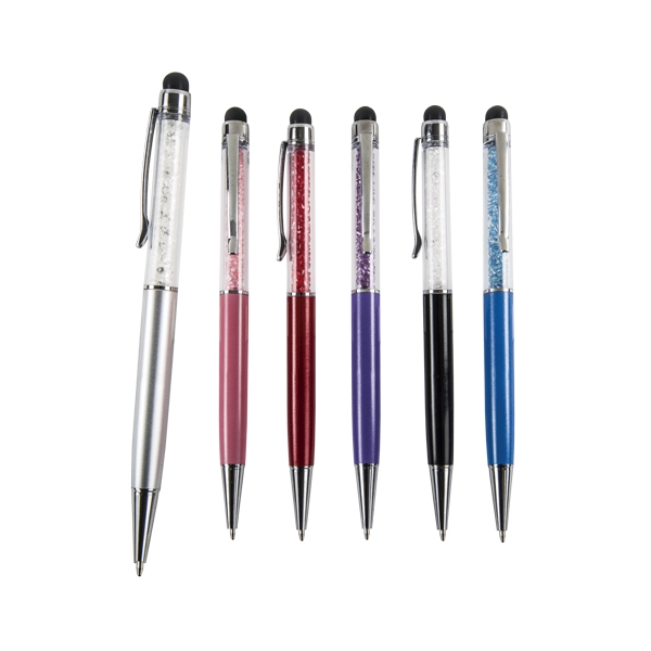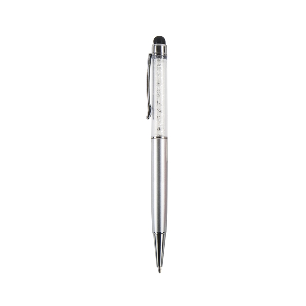 Descripción: Bolígrafo de plastico,mecanismo retráctil con apariencia metalica,clip metalico,goma touch screen y cristales en el cuerpo