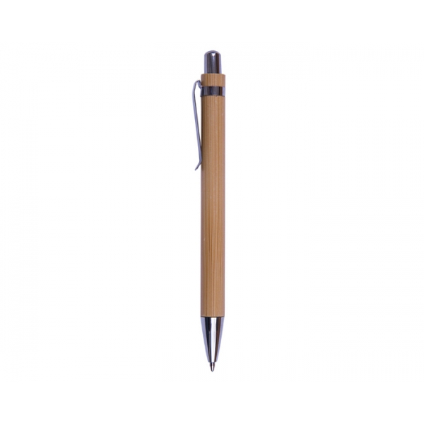 Descripción: Boligrafo de bambú, con botón, punta y clip metálico. Mecanismo de click.