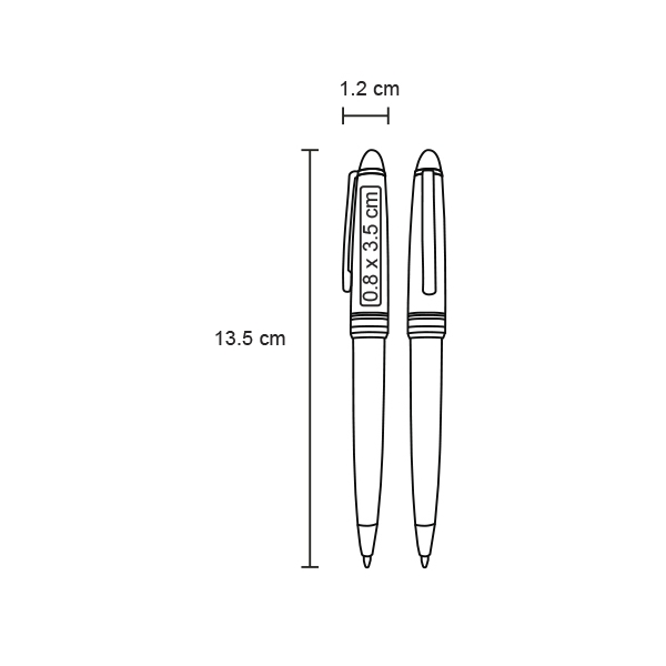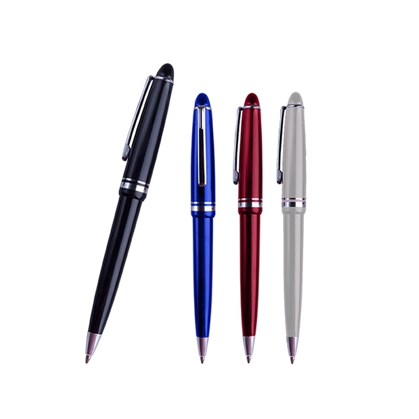 Descripción: Bolígrafo de plástico con apariencia metálica y clip metálico.