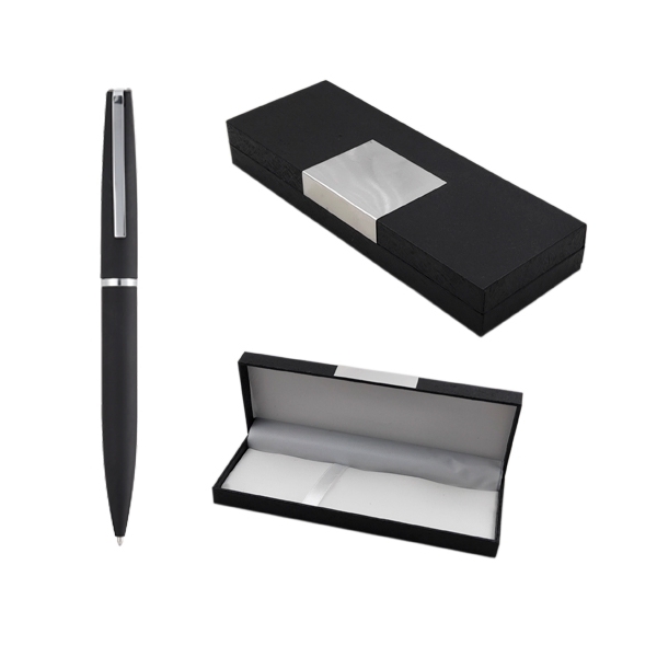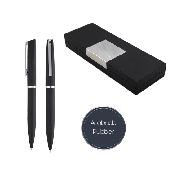Descripción: Bolígrafo metálico con tapa de plástico y acabado rubber en todo el cuerpo. Incluye estuche.