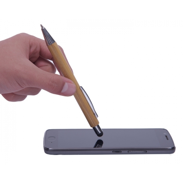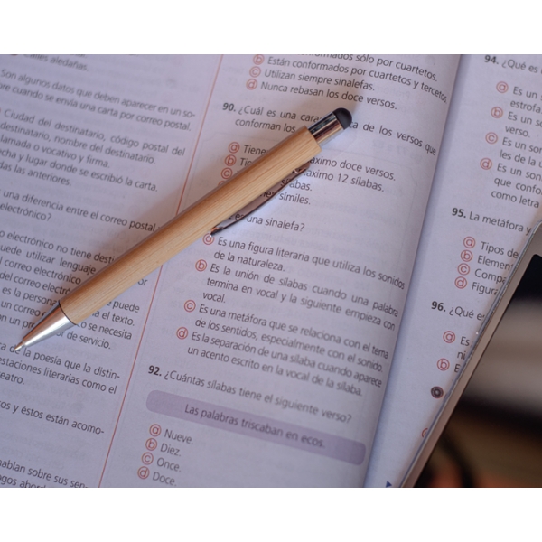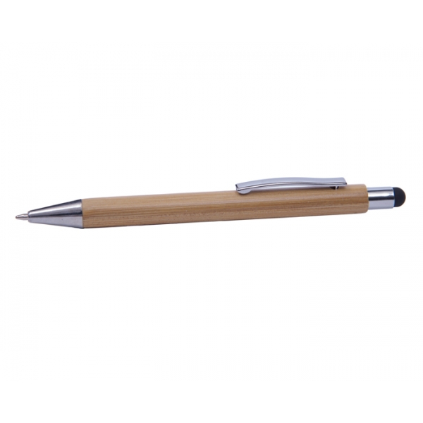 Descripción: Bolígrafo de bambú, clip y punta metálico. Punta touch. Mecanismo de click.