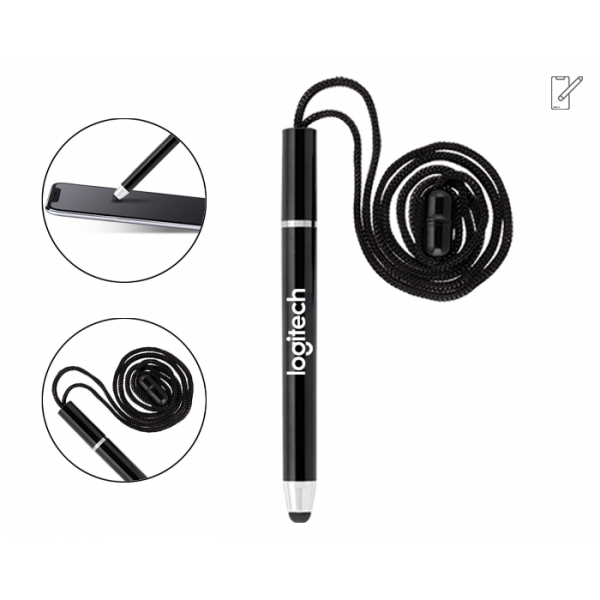 Descripción: Bolígrafo con goma óptica diseñada para imitar el dedo sobre dispositivos touch, con cordón y broche para colgar. Mecanismo retráctil.