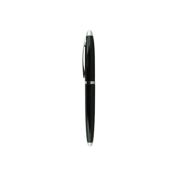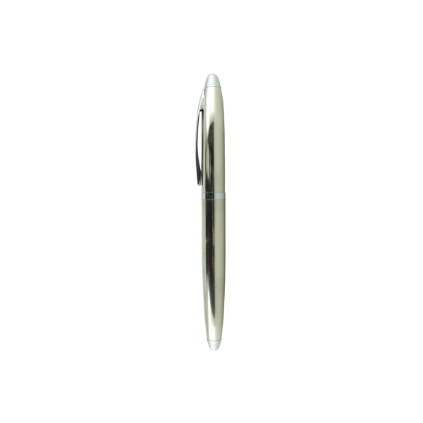 Descripción: Bolígrafo metálico con tapón que cierra a presión. Acabados brillantes. Detalles color cromo. Escritura de alto desempeño debido a su repuesto japonés tipo Roller (a elegir entre tinta negra o azul). Incluye estuche individual.