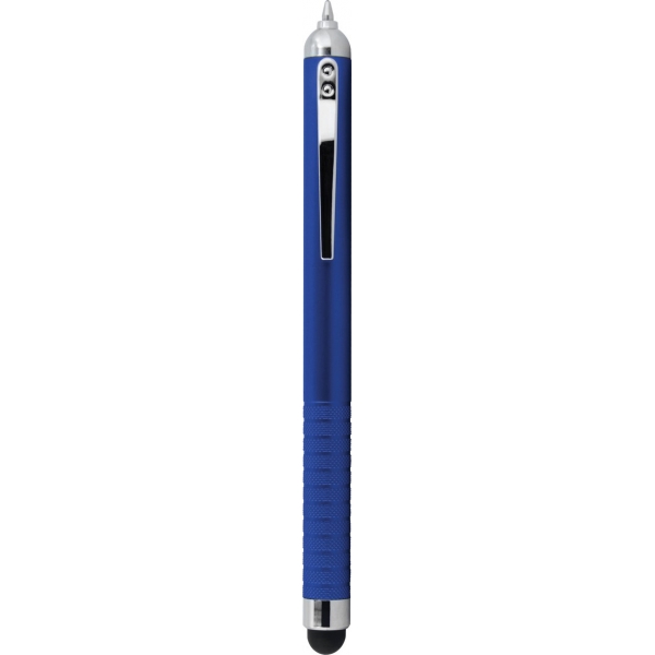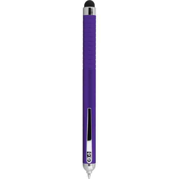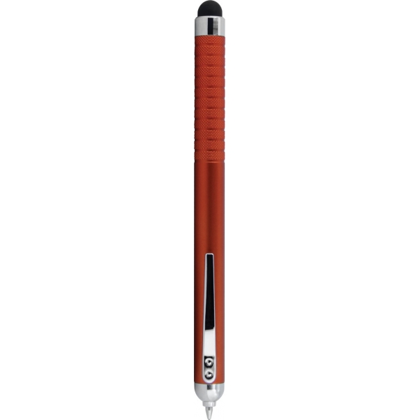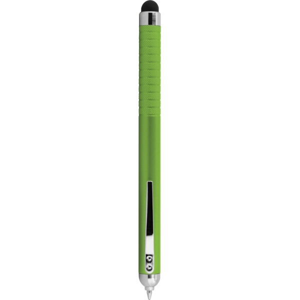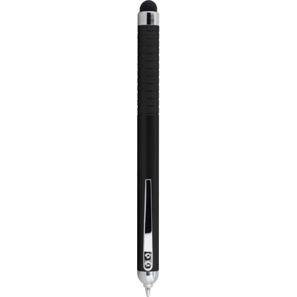 Descripción: Bolígrafo de plástico con apariencia metálica. La punta se oculta en la parte superior y queda visible al girar el bolígrafo. Con Touch en color negro del lado contrario a la punta. Detalles en color cromo. Tinta Negra.