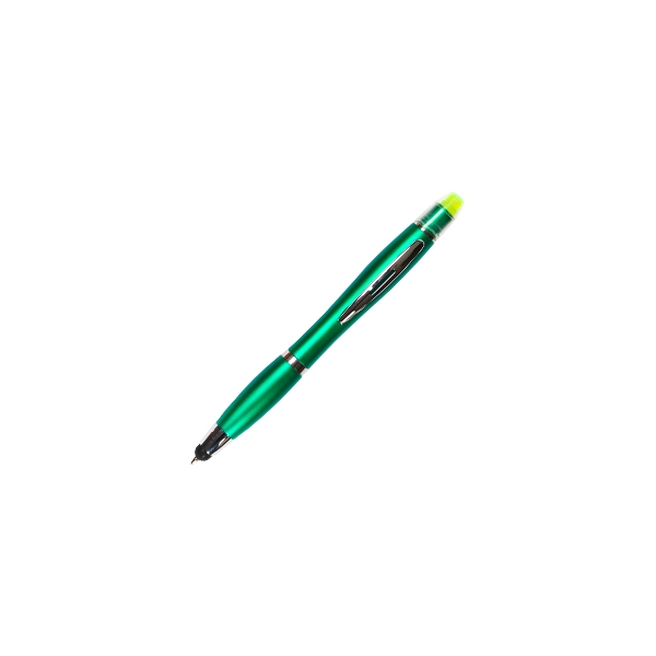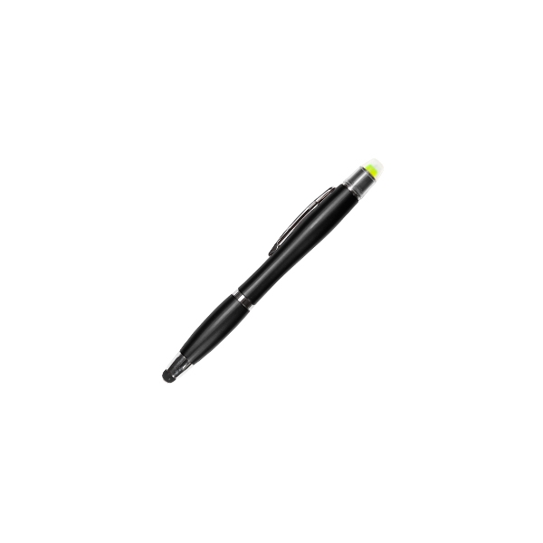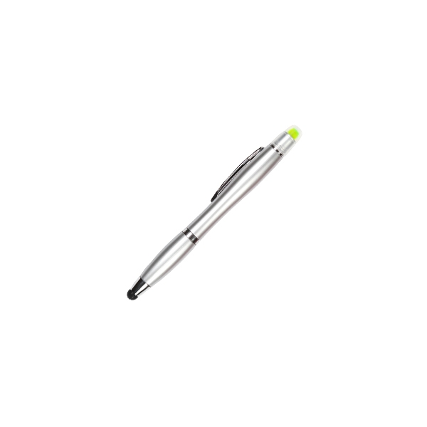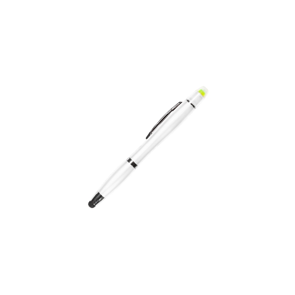 Descripción: Bolígrafo de plástico con touch y resaltador de cera. Tinta negra. Colores: azul, blanco, plata, morado, negro, naranja, rojo y verde.