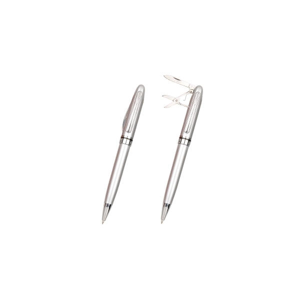 Descripción: Bolígrafo de plástico color plata con navaja y tijeras. Tinta negra.