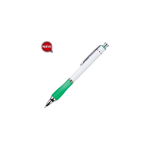 Descripción: Bolígrafo de plástico blanco con grip de goma amarillo. Tinta negra.