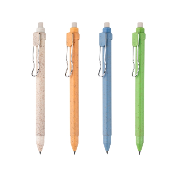 Descripción: Lápiz infinito con punta fabricada en mezcla de metales (no necesita tinta), goma, barril de fibra de trigo y clip metálico. Incluye caja de cartón individual.
