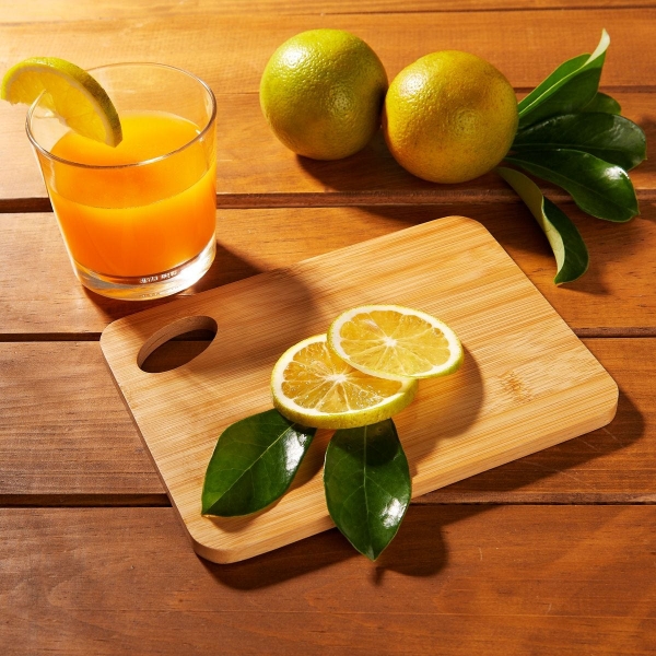 Descripción: Tabla para picar hecha de bambú. Tiene un tamaño compacto perfecto para espacios reducidos en la cocina. Cuenta con orificio en una de las esquinas que permite colgarla fácilmente cuando no está en uso.