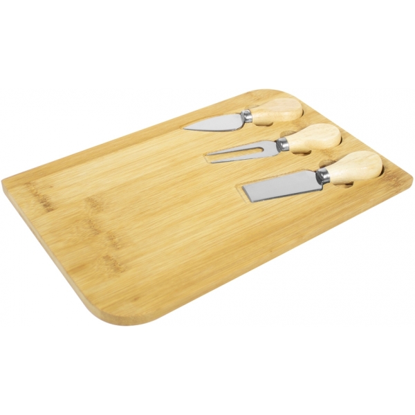 Descripción: Bambú y Acero inoxidable . Tabla de bambú con set de 3 utensilios de acero inoxidable 210 con mango de madera: 2 cuchillos y 1 tenedor. Tabla para cortar y presentar diferentes quesos acompañada de un buen vino tinto en tus próximas reuniones. Presentación en caja de regalo.