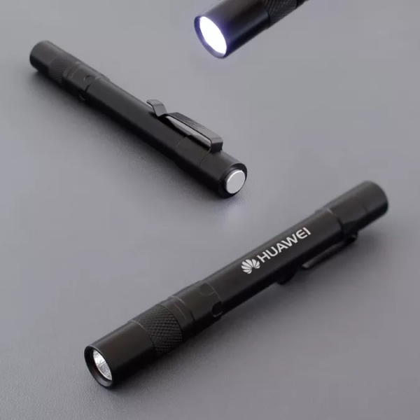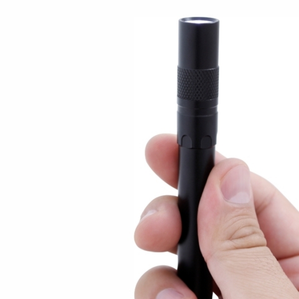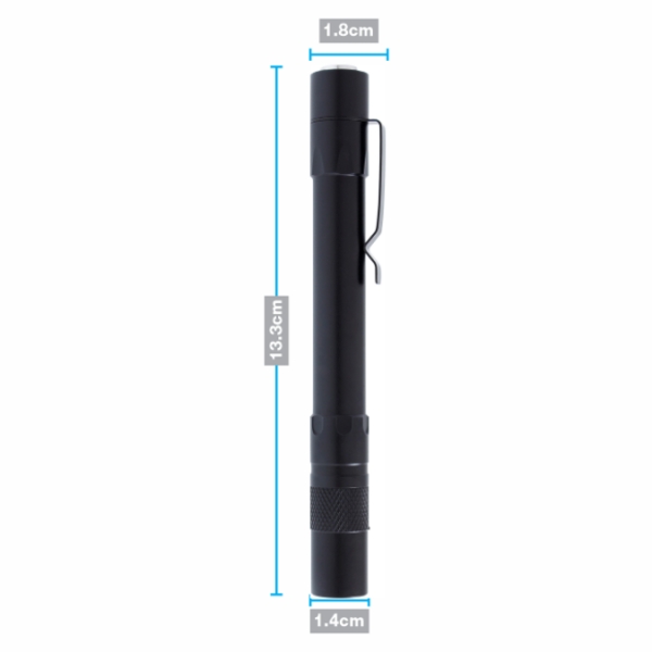 Descripción: Linterna de bolsillo fabricada en aluminio torneado. Cuenta conClip para sujetarla al bolsillo.Luz led de alta luminosidad que se acciona con un botón en laparte superior. Funciona con 2 baterías AAA (No incluidas).