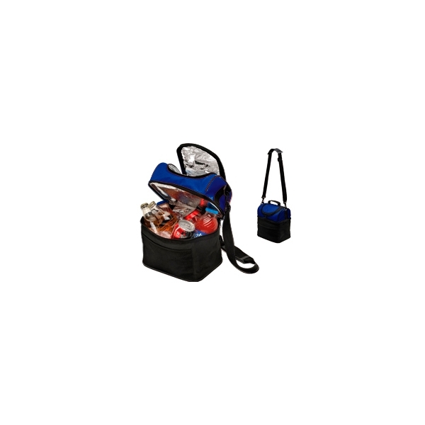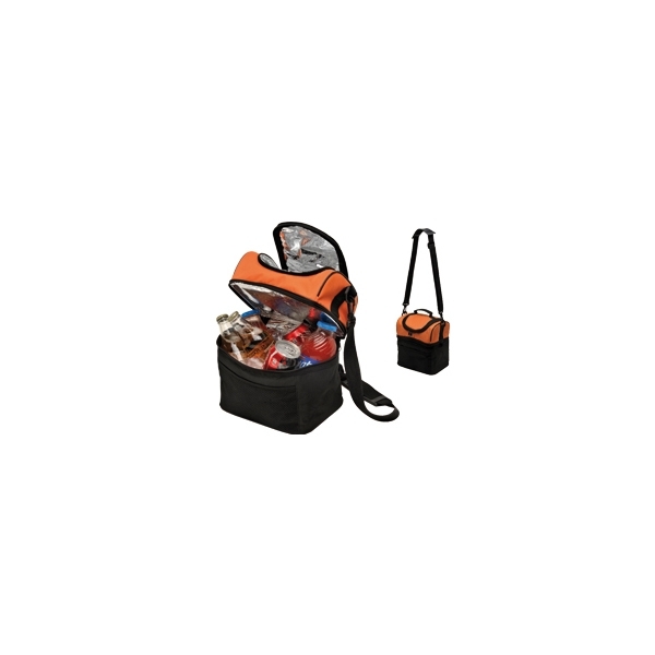 Descripción: Hielera de doble compartimiento fabricada en nylon con forro de aluminio, correa de hombro regulable. Colores: naranja, azul, blanco y rojo.