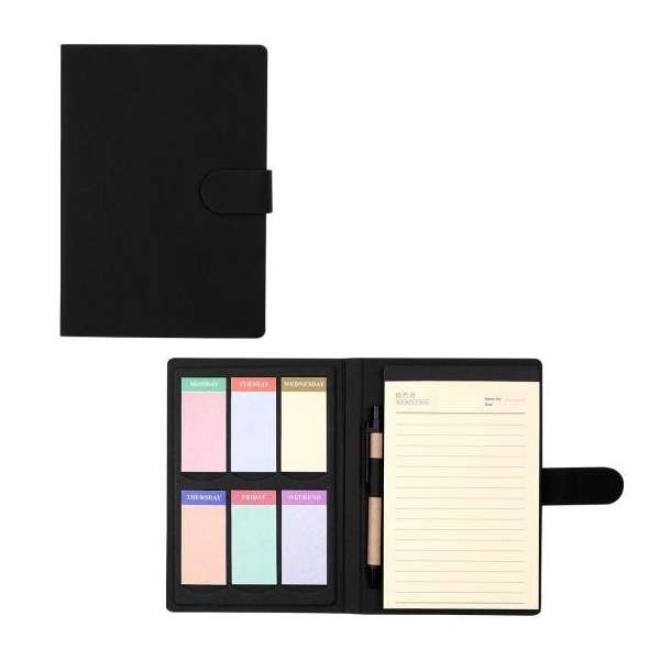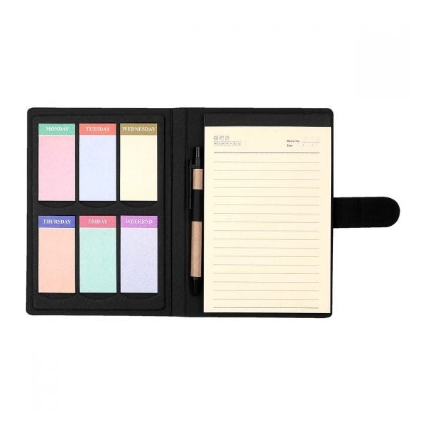 Descripción: Incluye notas adheribles con los días de la semana, block de notas medida 12 x 18 cm con 70 hojas de raya, bolígrafo ecológico y broche imantado.