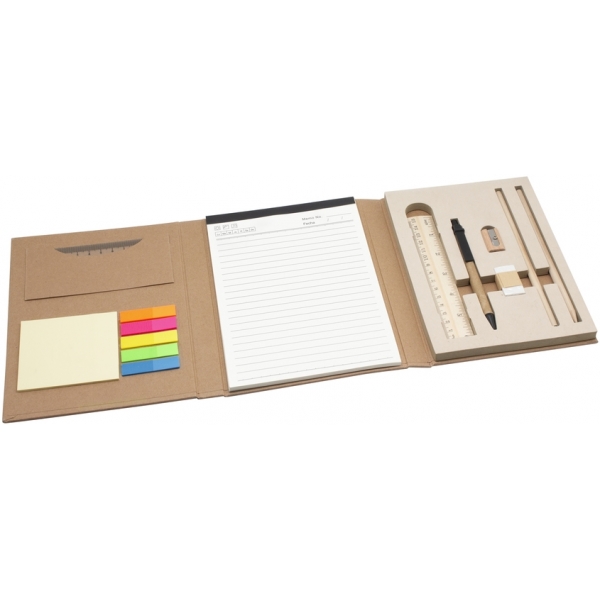 Descripción: Cartón kraft de gran firmeza. Cuaderno anotador múltiples funciones. El kit contiene: un block de hojas rayadas con fecha y dia de la semana, regla de madera, regla de pvc, dos lápices negros, goma de borrar, sacapuntas y bolígrafo tinta negra. Ademas un set de Post- it cuadrados amarillos y tiras plásticas autoadhesivas de diferentes colores (azul, verde, amarillo, rosa y naranja). El cierre del cuaderno es con una banda elástica de color negro que permite una buena sujeción.