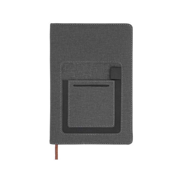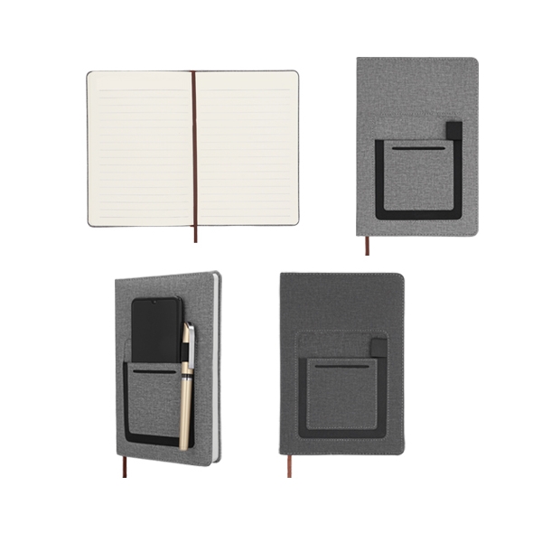 Descripción: Libreta de poliuretano texturizada con compartimento para celular y resorte para pluma en la pasta, 116 hojas rayadas y separador.