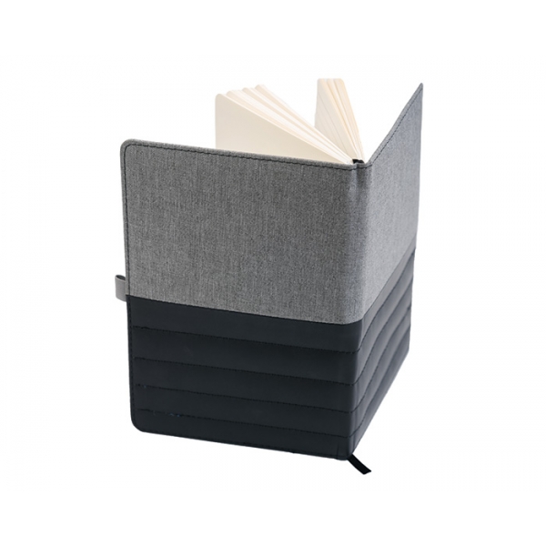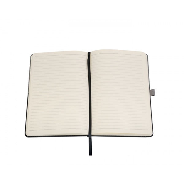 Descripción: Libreta vertical A5 de pasta rígida con cubierta tipo curpiel. De 80 hojas rayadas (160 páginas). Separador de listón y porta bolígrafo elástico.