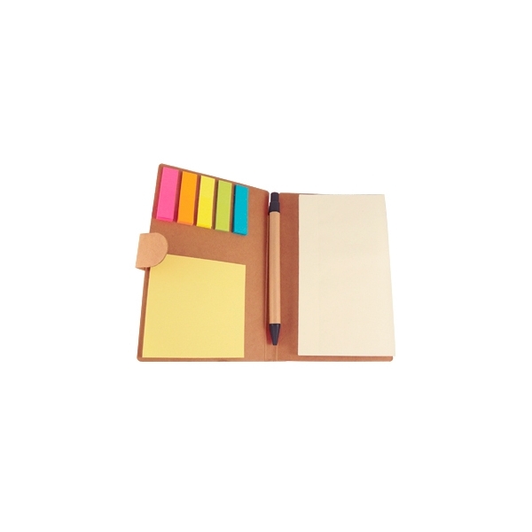 Descripción: Carpeta ecológica con 50 hojas blancas, 25 notas adhesivas, banderitas de colores 125 en 5 colores y pluma de tinta negra.