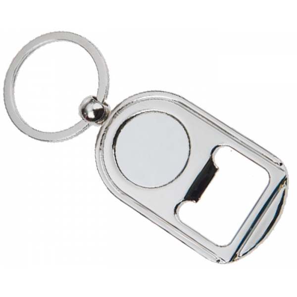Descripción: Llavero metálico oval con destapador y arillo reforzado.
